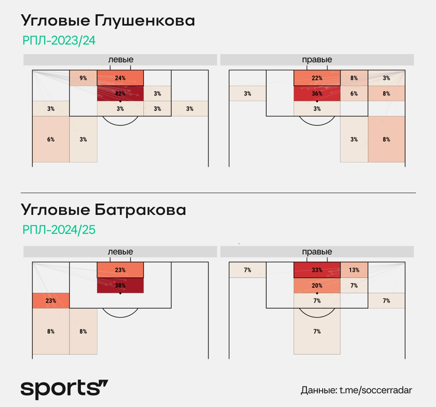 Интересно, что правша Батраков справа подает на ближнюю штангу даже чаще левши Глушенкова. Иногда это даже не подачи – Батраков немного поднимает мяч над газоном, выполняя что-то похожее на прострел (так было против «Акрона», «Ахмата» и Махачкалы).