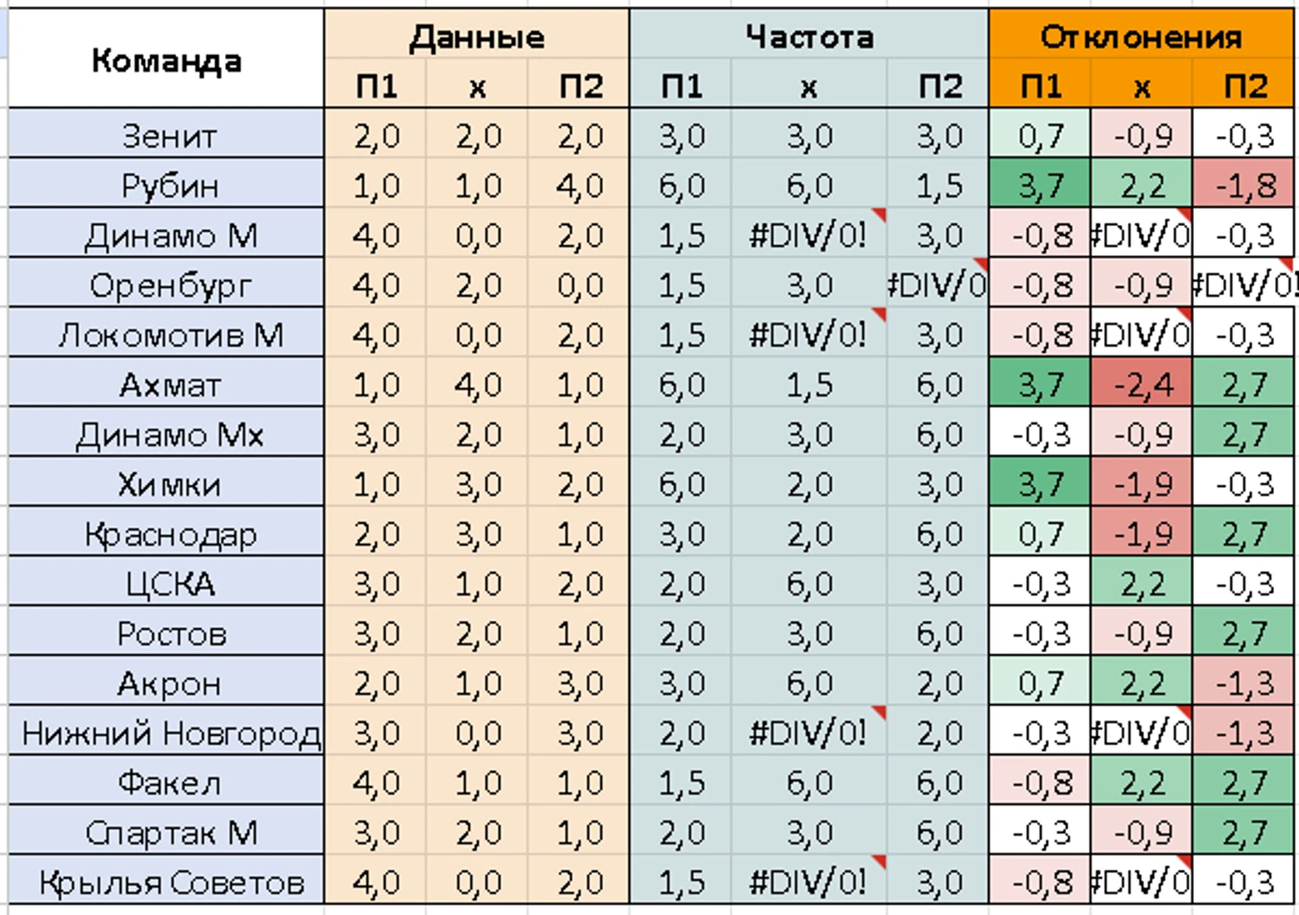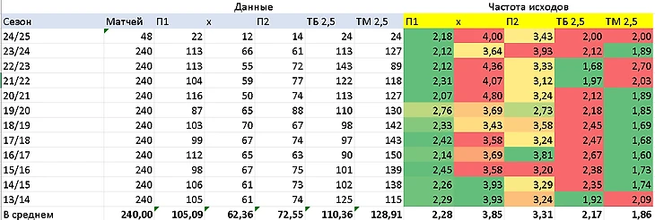 Как видно из таблички, текущий сезон РПЛ выровнялся по частоте исходов на П1\Х\П2, хотя пару туров назад П1 игралось очень редко. Я сразу говорил, что П1 будет добираться по исходам и от этого никуда не деться никому! Так оно и случилось!