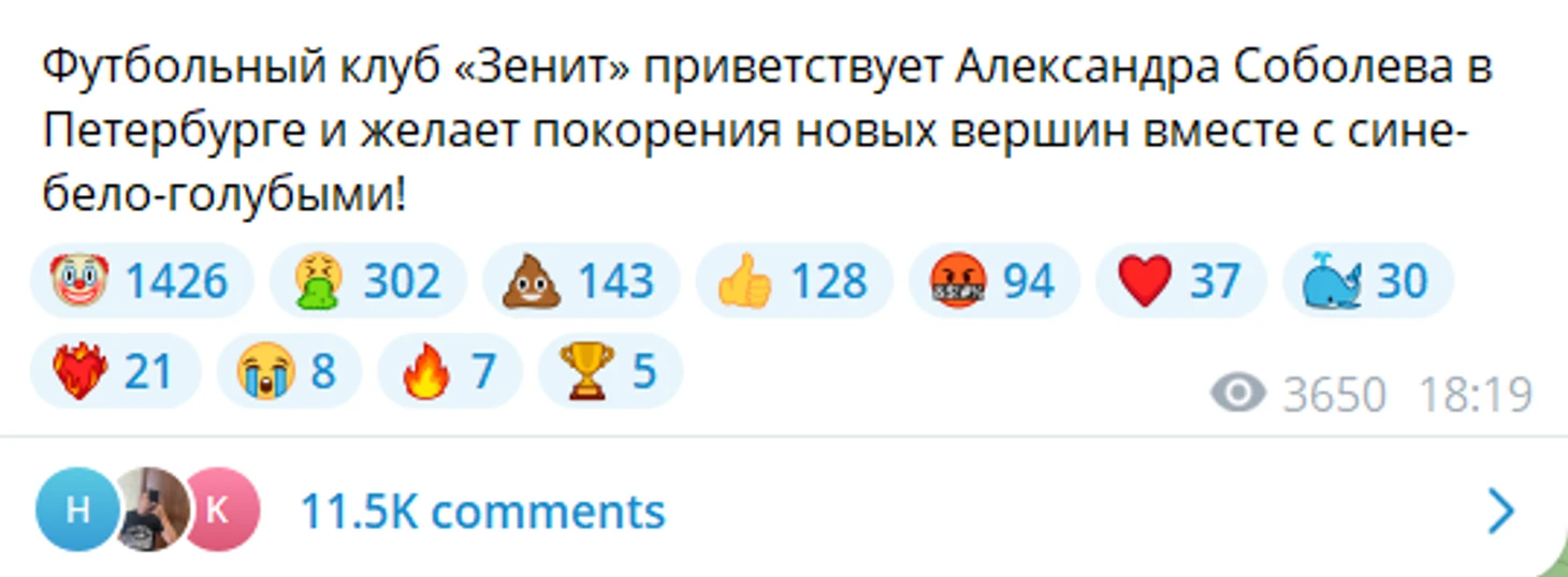 🤡🐳 Больше двух тысяч клоунов, четыре тысячи китов. Реакции на Соболева в «Зените»