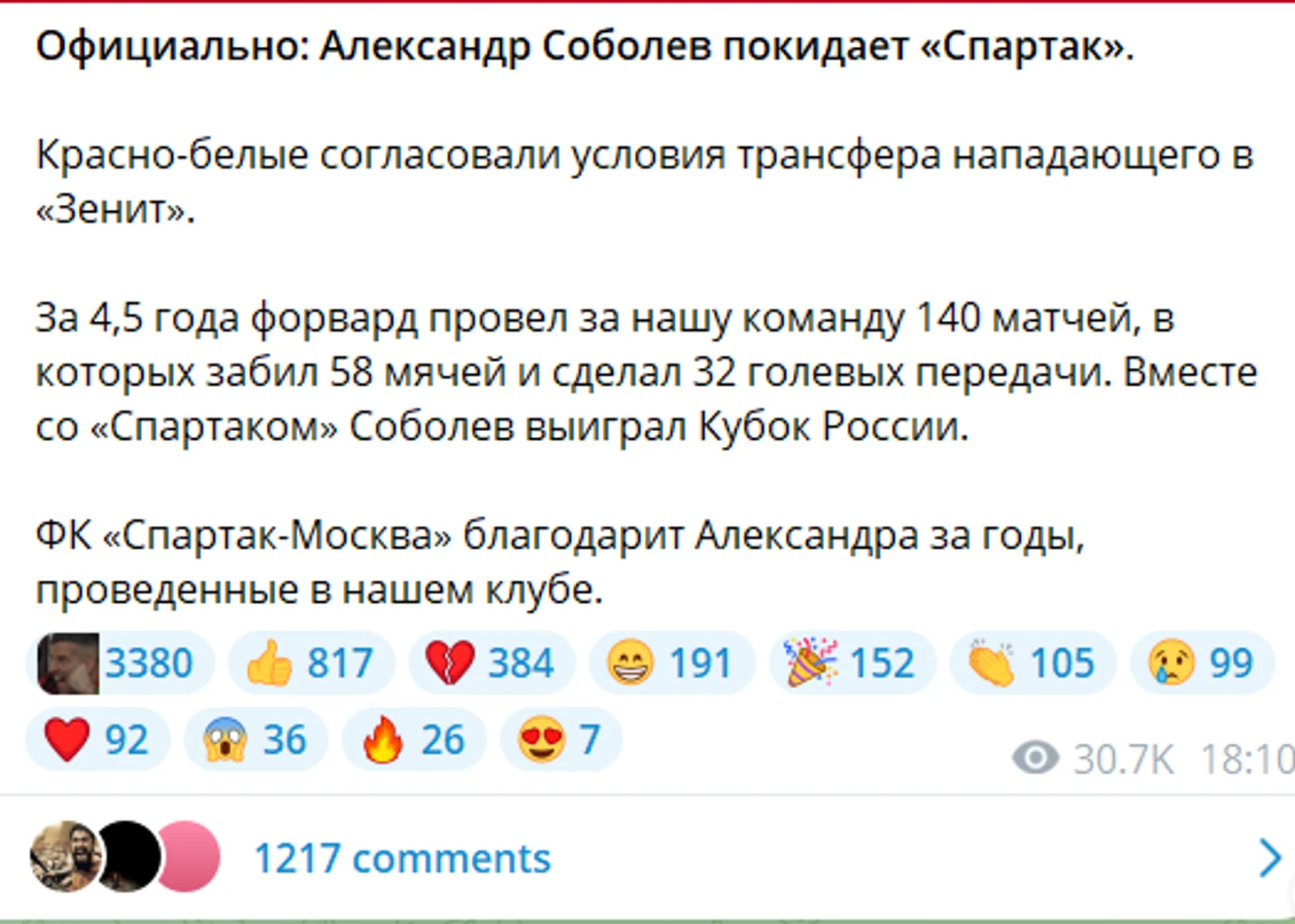 Переход Александра Соболева из «Спартака» в «Зенит» – главная тема дня (а то и всего лета). Вопрос разрешился – и все эмоции болельщиков обоих клубов выплеснулись в телеграм-каналы клубов и нападающего. Какие же реакции собрала эта новость?