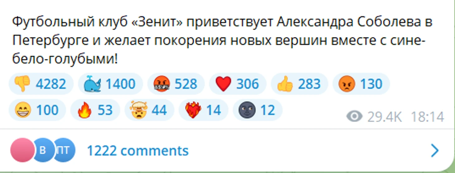 Но, конечно, больше всего негатива собрали репосты в канале самого Соболева. Новичок «Зенита» сначала собрал больше тысячи блюющих эмодзи...
