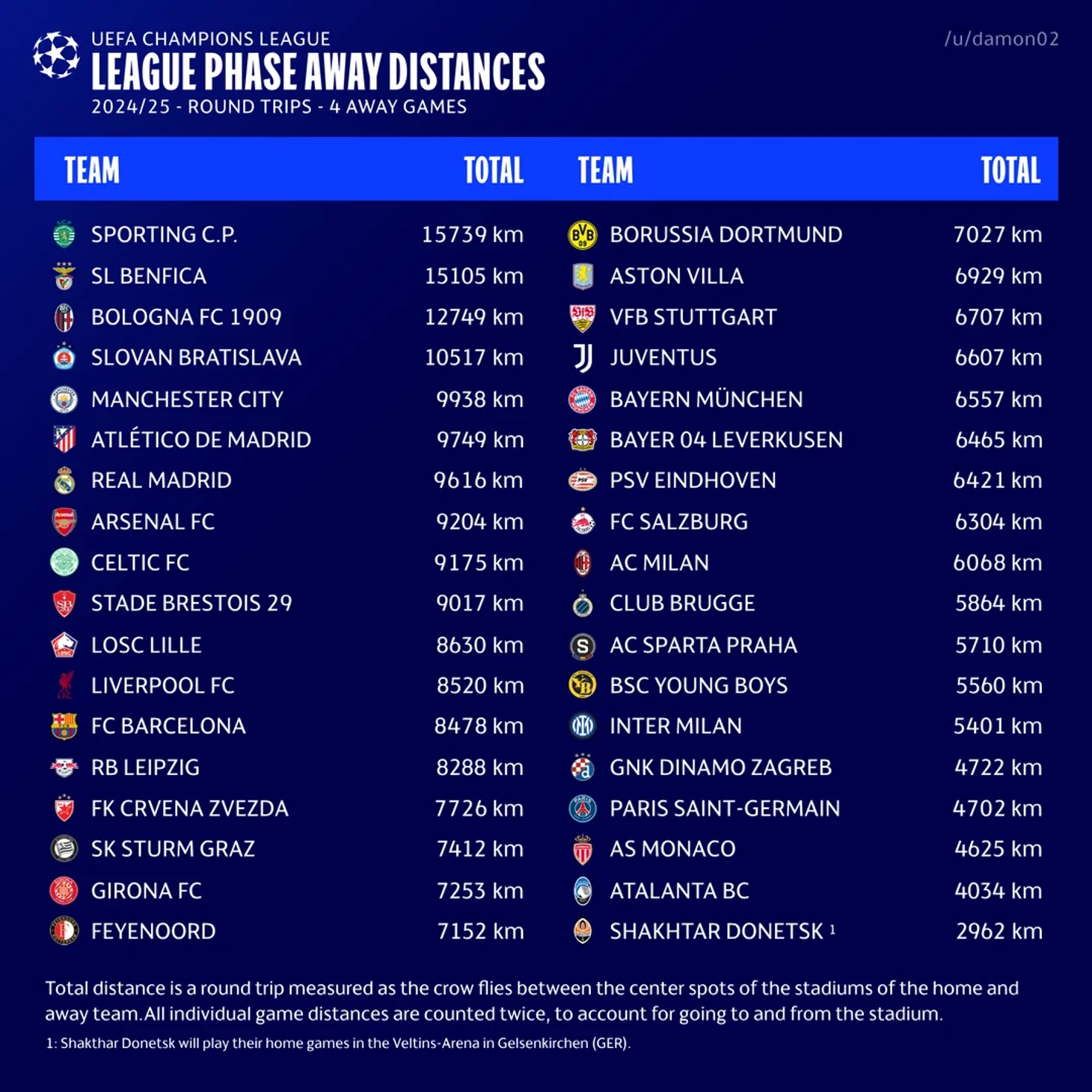 Если создать своеобразный топ-5 (или даже топ-10) дальних выездов, то в него не войдет ни один клуб Лиги чемпионов. Можно утверждать, что сильнейшие клубы Европы географически находятся на небольшом друг от друга расстоянии.