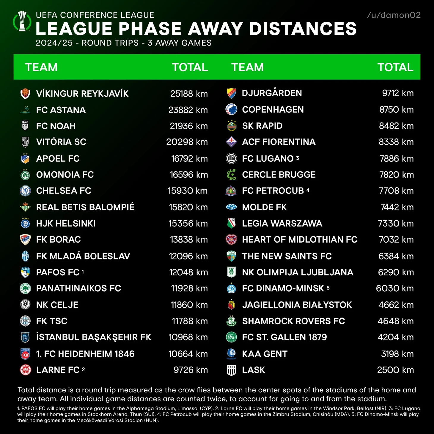 Расписания для всех команд пришлось подождать до субботы и теперь можно окончательно узнать, какое расстояние придется покрыть командам, играющим в еврокубках, для участия в выездных матчах. Расстояние рассчитывали от домашнего стадиона команды до того, на котором он будет играть в гостях.