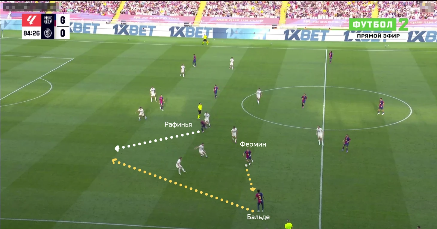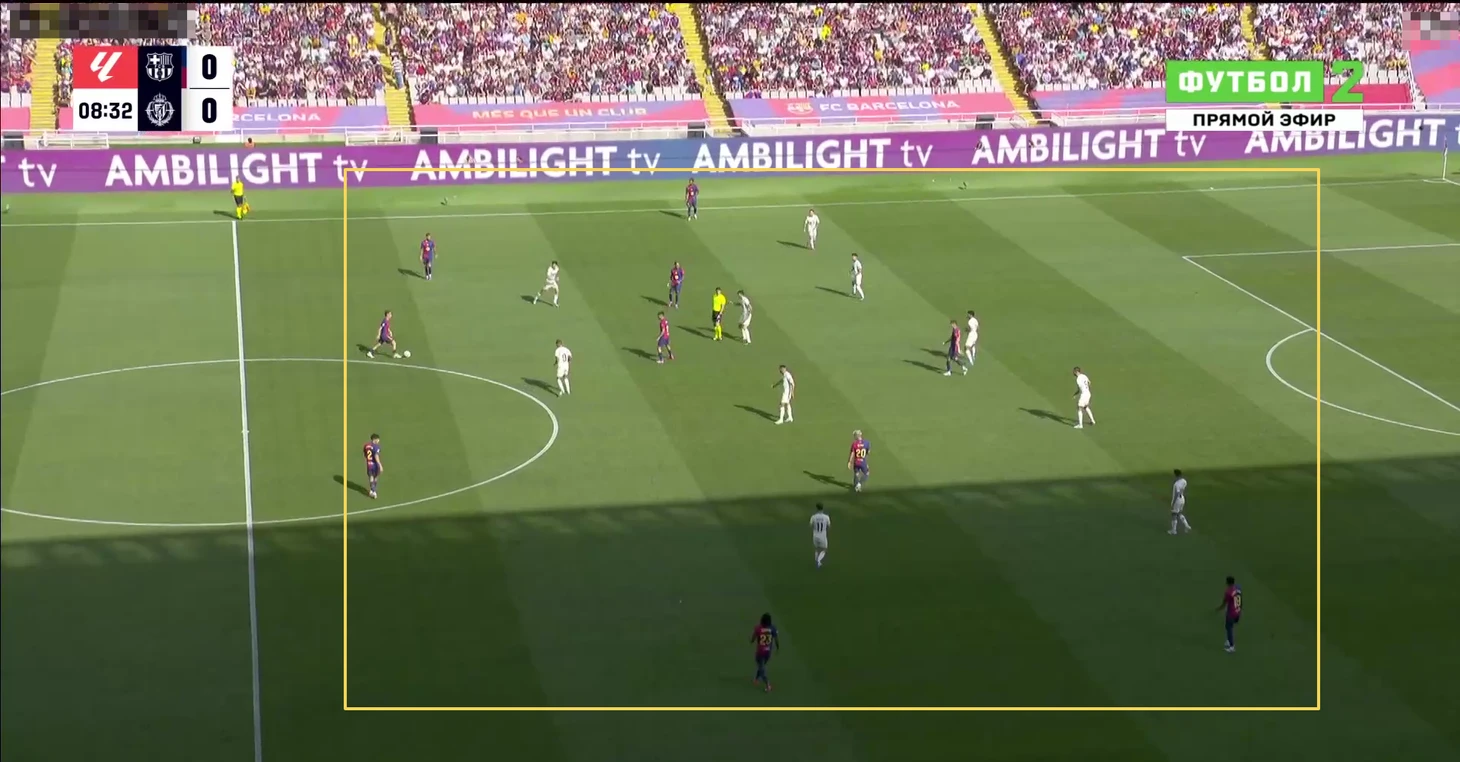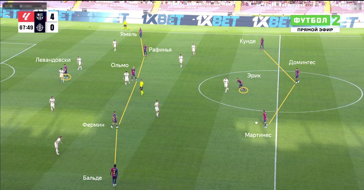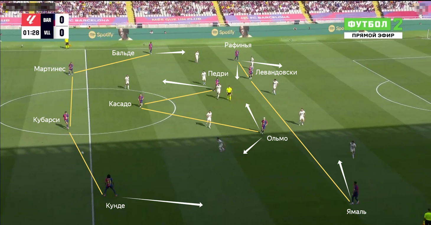 Так как у «Барселоны» впереди часто оказывается 6 футболистов, Кунде и Ямаль вынуждены правильно делить зоны. Если Ламин находится в широкой позиции, то Жюль действует в полуфланге. Если Ямаль смещается в центр, то Кунде идет на фланг.
