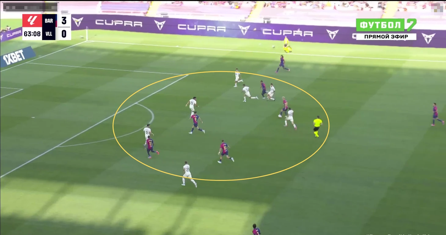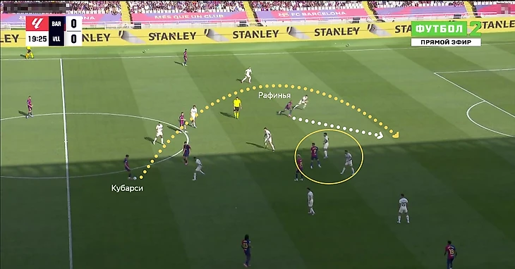 Первый гол – защитники соперника оставили свободное пространство, на Кубарси не оказывается давление – Пау делает заброс на своевременный рывок партнера. Также отмечаем действия Левандовского, который стягивал на себя игроков «Вальядолида».