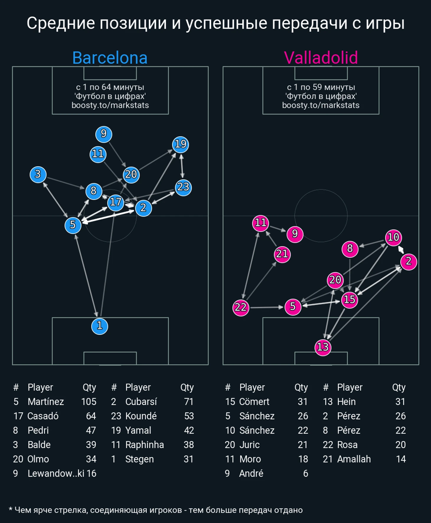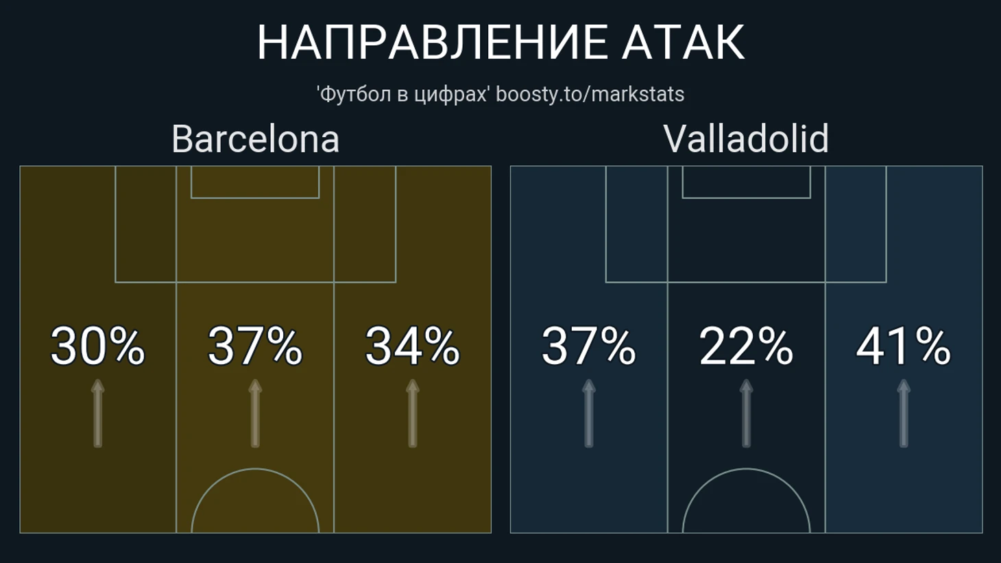 «Барса» при Флик становится более вертикальной. При этом команда не делает ставку исключительно на прямолинейную доставку по краям поля. Например, против «Вальядолида» направления атак каталонцев распределились достаточно равномерно (через центр – даже больше).