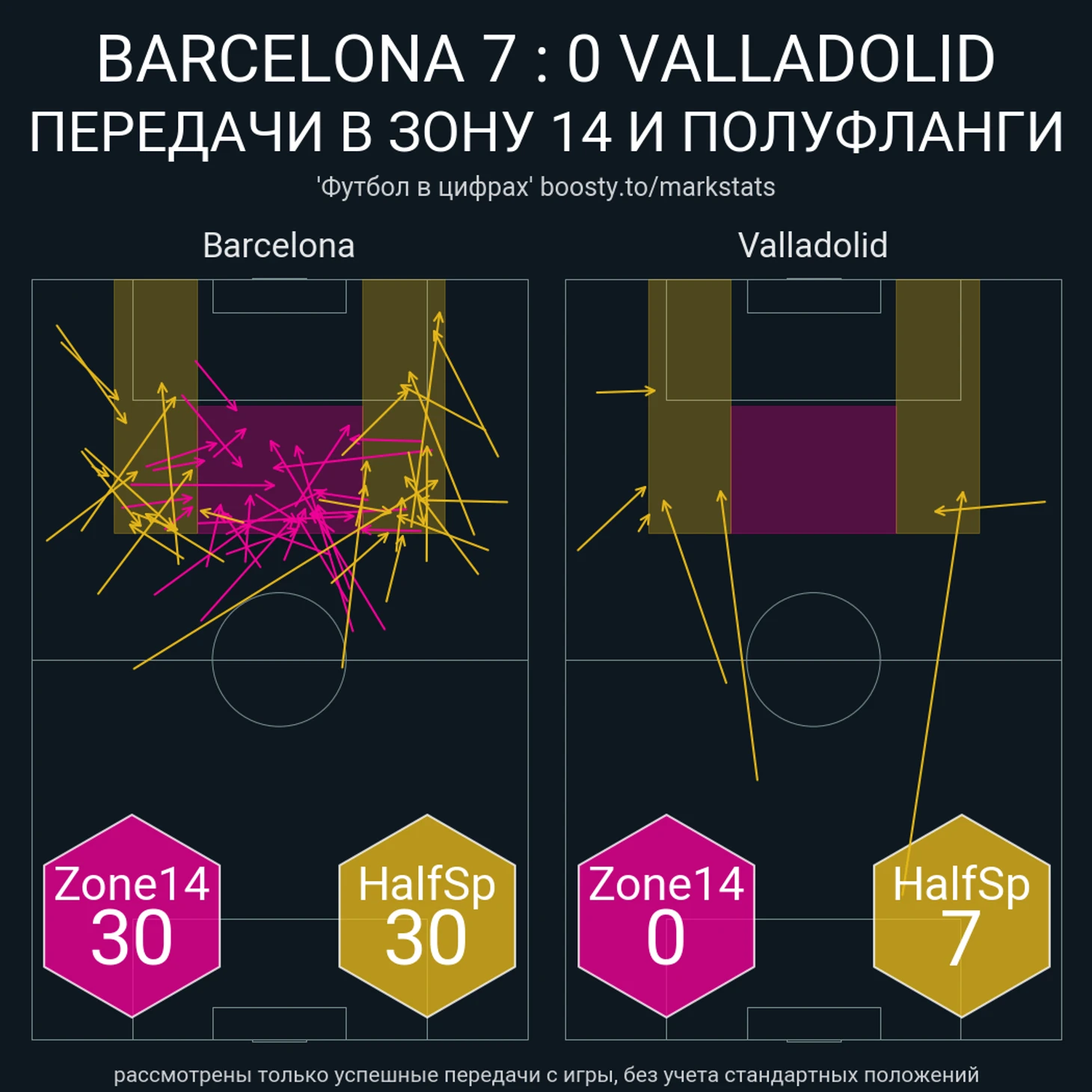 «Барселона» дома разгромила «Вальядолид» 7:0 – последний раз с такой разницей каталонцы побеждали еще в 2016-м. Матч получился максимально односторонним, поэтому логичнее сфокусироваться именно на действиях «Барсы» в атаке.