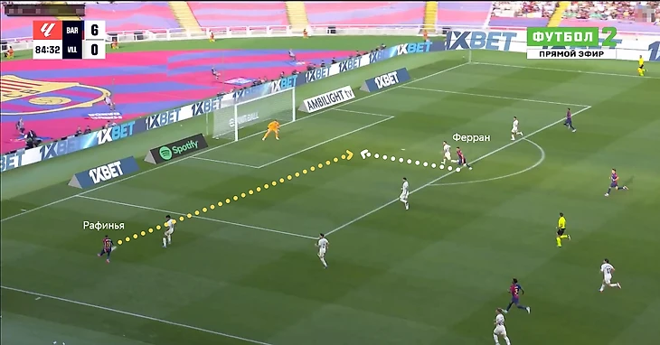 Еще один пример: футболисты «Барселоны» увидели свободное пространство и воспользовались им – Рафинья ассистировал на Феррана фланговой передачей.