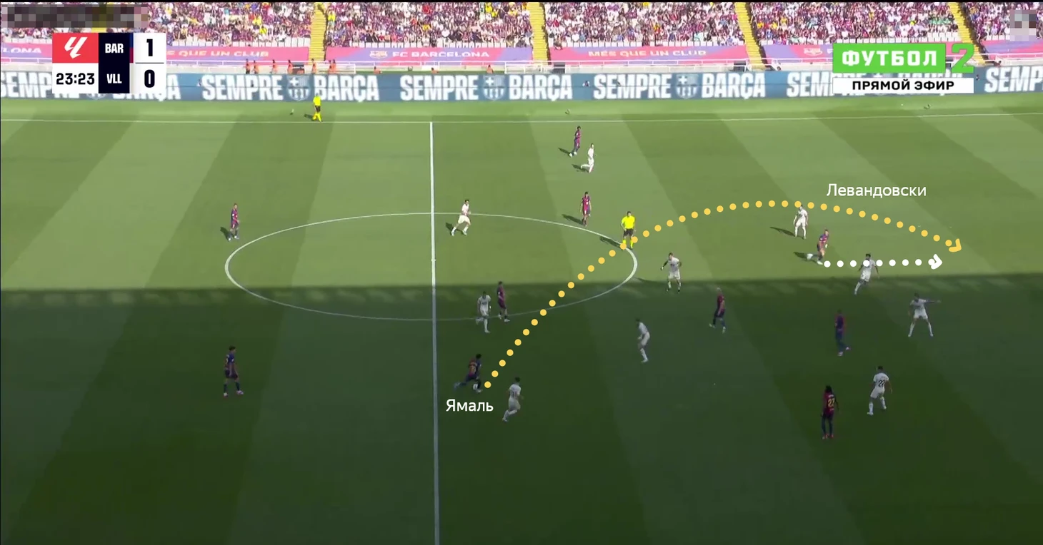Здесь снова видим адаптации игроков друг под друга. Ямаль получает мяч на краю поля и смещается в середину, Кунде в это время заполняет более высокую позицию. Итог – Ламин наказывает соперника забросом на Левандовского.