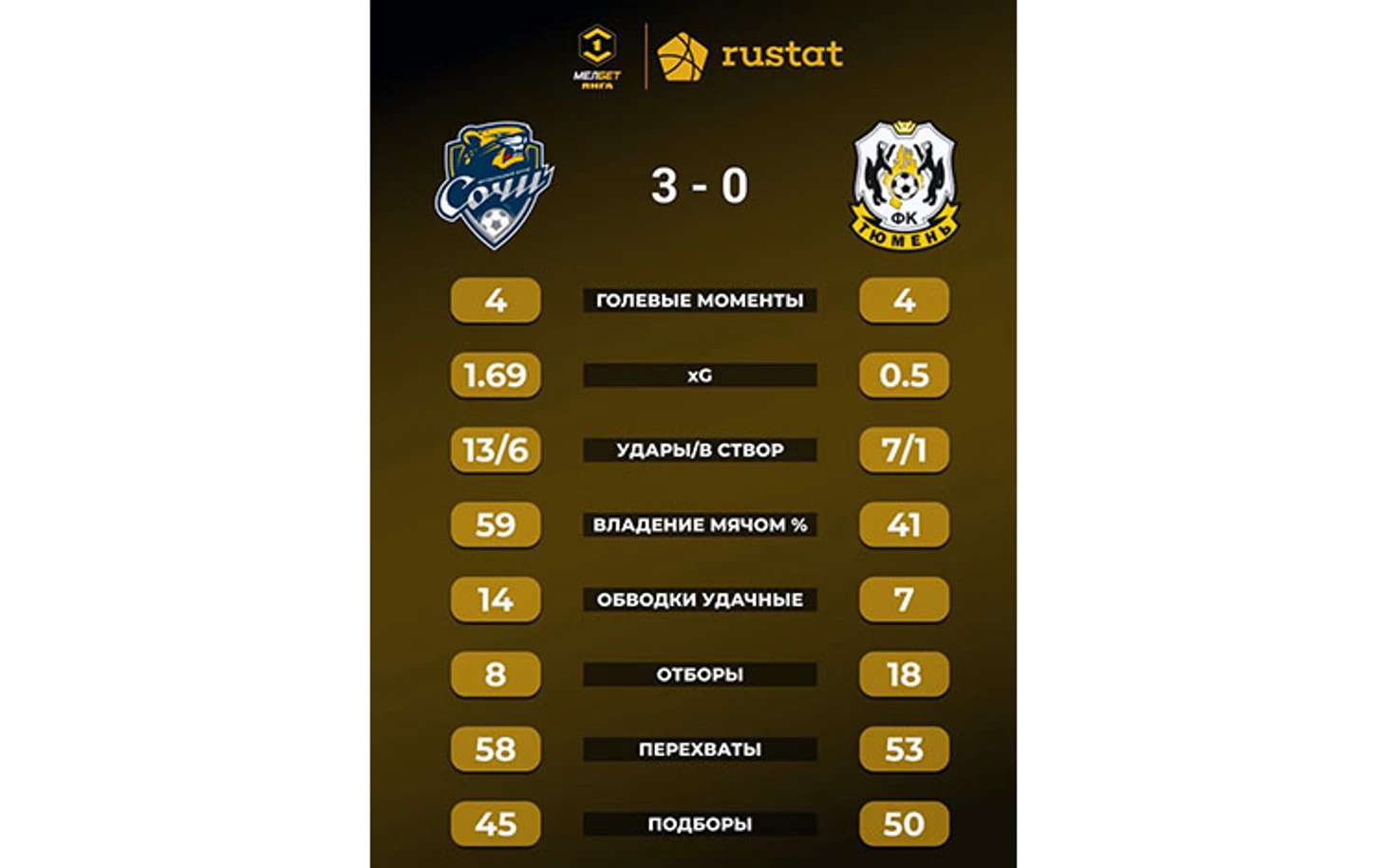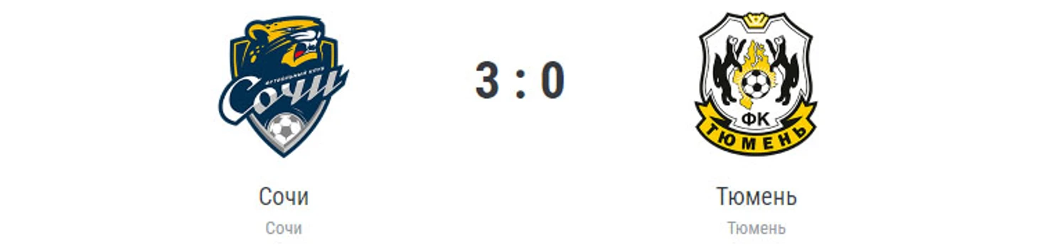 Голы: Писарский, 45+1 (1:0). Писарский, 70 (2:0). Крамарич, 88 (3:0). «Сочи»: Карабашев, Заика, Суслов, Кожемякин (Литвинов, 83), Макарчук, Кравцов (Макаров, 82), Начо, Сафронов (Магаль, 72), Никитин (Барт, 72), Писарский (Гуарирапа, 82), Крамарич. «Тюмень»: Крицюк, Бем (Воропаев, 75), Сухорученко, Шавлохов, Храмцов, Кенфак, Талалай (Купцов, 75), Кленкин, Ткачук (Кулишев, 60), Петров (Коротаев, 46), Карпов (Косарев, 67). Наказания: Храмцов, 14. Крамарич, 45. Кленкин, 50. Карпов, 55. Коротаев, 77. Барт, 85. Кенфак, 90+1 (предупреждения). Судья: Жабченко (Краснодар). 1 сентября. Сочи. Стадион «Фишт». 4964 зрителя.