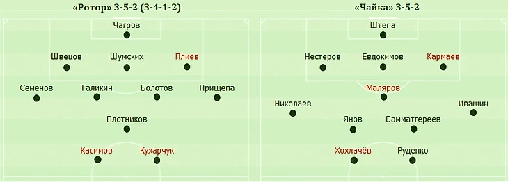 Обе команды использовали схемы с тремя центральными защитниками. Они отличались друг от друга только тем, что у «Ротора» в пятёрке хавбеков был ярко выраженный атакующий футболист, а у «Чайки», наоборот, оборонительный.