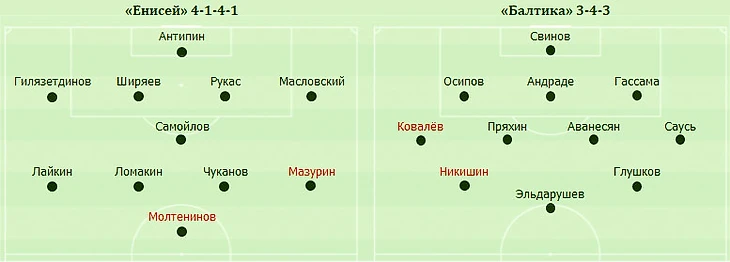 Из-за дефицита крайних защитников балтийцы решили сыграть этот матч по новой схеме – с тремя центральными защитниками. Одним из них стал Осипов. Впереди действовало трио Никишин – Эльдарушев – Глушков, а атакующий хавбек Пряхин на этот раз играл в центре средней линии.