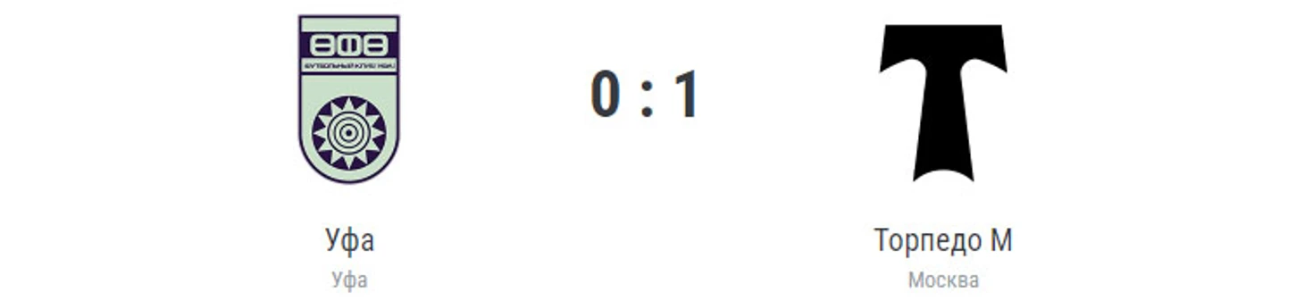 Гол: Соколов, 84. «Уфа»: Баклов, Перченок, Захаров, Кутин, Карпов, Мацхарашвили (Пасевич, 46), Анисимов (Муллин, 87), Адаев, Агеян (Гараев, 85), Ложкин (Гыстаров, 73), Гуренко (Ушахин, 85). «Торпедо» (Москва): Бабурин, Шевченко, Данилкин, Бородин, Роганович, Нетфуллин, Чурич (Байтуков, 90+2), Камара (Соколов, 67), Манелов (Червяков, 83), Чупаев (Максимов, 83), Корян (Галкин, 67). Наказания: Адаев, 6. Перченок, 19. Карпов, 47 (предупреждения). Судья: Силантьев (Самара). 31 августа. Уфа. Стадион «Нефтяник». 2320 зрителей.