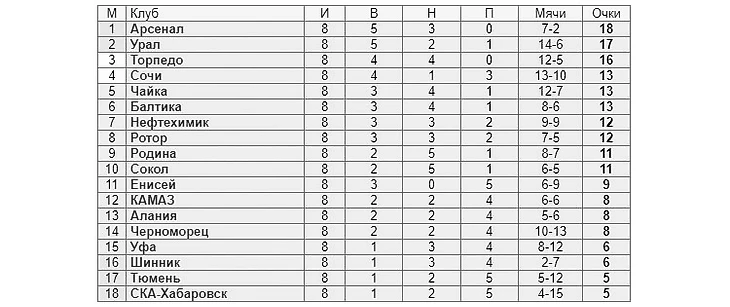 После восьми проведённых в Первой лиге туров в небольшой отрыв ушли три клуба – «Арсенал», «Урал» и «Торпедо». Группу их преследователей возглавляют «Сочи», «Балтика» и выходец из Второй лиги «Чайка».