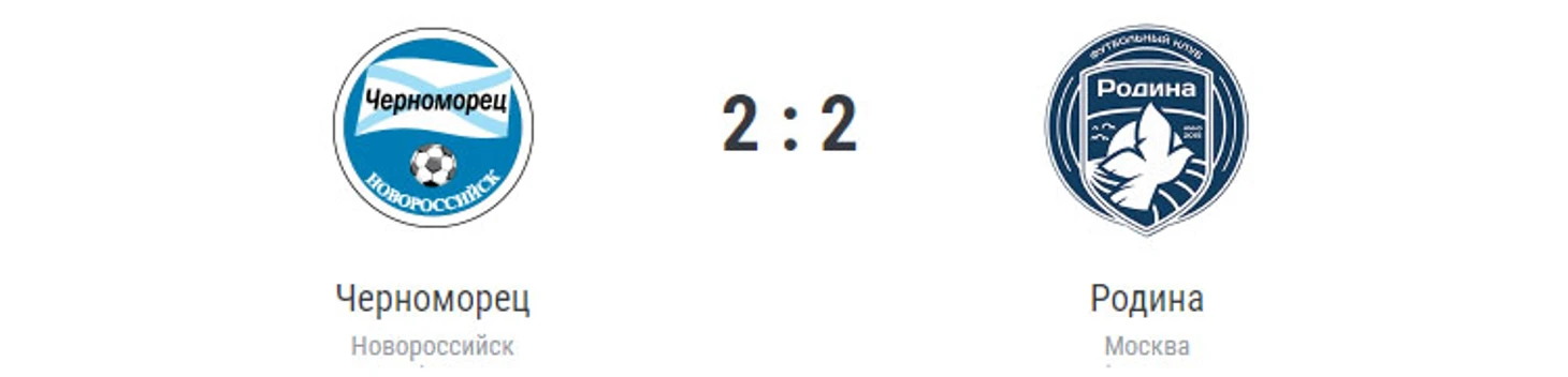 Голы: Стежко, 34 – в свои ворота (0:1). Крижан, 35 – в свои ворота (1:1). Юшин, 62 (1:2). Чичинадзе, 67 (2:2). «Черноморец» (Новороссийск): Фролкин, Красильниченко (Мусалов, 87), Стежко, Чичинадзе, Хабалов (Гурченко, 62), Иванов, Енин, Ланин, Родионов (Антонов, 70), Кротов (Окладников, 70), Уридия (Черов, 87). «Родина» (Москва): Корякин, Мещанинов, Клещенко, Крижан, Рядно, Мусаев, Фищенко (Кане, 76), Шадринцев, Гордюшенко, Концевой (Кожедуб, 58), Юшин. Наказания: Стежко, 2. Фищенко, 9. Родионов, 33. Красильниченко, 78. Гордюшенко, 79. Антонов, 90 (предупреждения). Судья: Анопа (Благовещенск). 1 сентября. Новороссийск. Стадион «Центральный». 6472 зрителя.