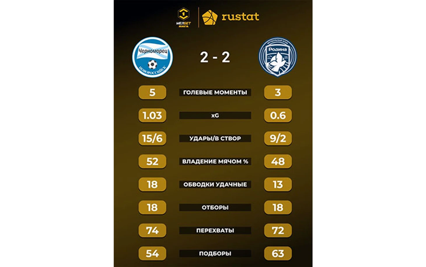 ● «Родина» четвертый раз подряд сыграла вничью, причем в трёх из этих четырёх матчей фиксировался счёт 2:2. ● «Черноморец» пока ещё ни разу не побеждал «Родину». Команды провели четыре официальных матча. Два из них завершились победами москвичей, а еще два – вничью. ● «Черноморец» остаётся единственной командой лиги, пропускавшей в каждом из восьми проведённых туров.