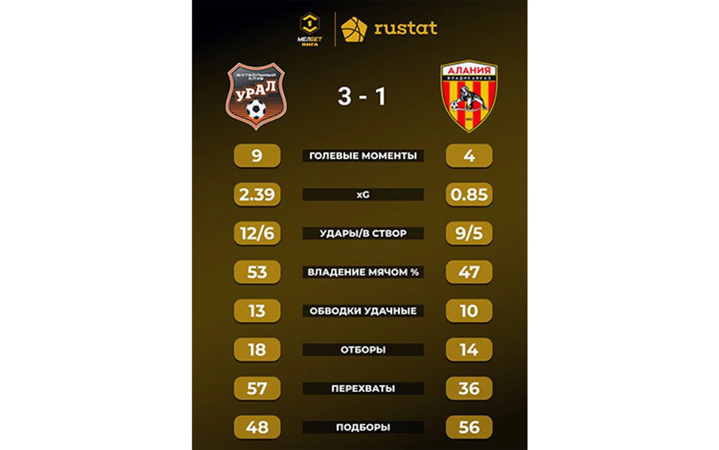 Голы: Аюпов, 24 (1:0). Нафиков, 78 (1:1). Аюпов, 83 – с пенальти (2:1). Секулич, 90 (3:1). «Урал» (Екатеринбург): Арапов, Маргасов, Арт.Мамин, Бегич, Гогличидзе, Аюпов, Сунгатулин (Чудин, 88), Егорычев (Филипенко, 88), Ишков (Мосин, 62), Бикфалви (Железнов, 70), Ионов (Секулич, 70). «Алания» (Владикавказ): Солдатенко, Плиев, Татаев, Багаев (Дауров, 46), Москаленчик (Цаллагов, 83), Макаров, Тарба, Кокоев (Гаглоев, 46), Чимези (Хугаев, 62), Абдоков (Тобоев, 77), Нафиков. Наказания: Татаев, 36. Москаленчик, 69. Плиев, 81. Железнов, 82. Тарба, 82. Секулич, 90+5 (предупреждения). Судья: Сиденков (Санкт-Петербург). 31 августа. Екатеринбург. Стадион «Екатеринбург Арена». 11 876 зрителей.