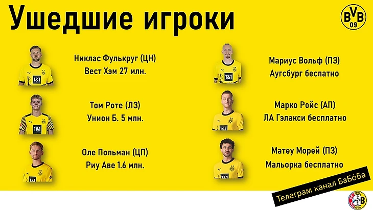 Что касается тех, кто клуб покинул, то тут целая плеяда громких имён. Никлас Фулькруг удивил многих болельщиков, когда попросился в «Вест Хэм». Нападающий провёл в клубе лишь один сезон, но уже оказался открыт для перспектив продолжить карьеру где-нибудь ещё. Том Роте, игравший в прошлом сезоне во 2 Бундеслиге в «Киле», теперь дорос до элитного дивизиона, но с «Унионом». Бесплатно из клуба оказались отпущены Мариус Вольф и Матеу Морей, а с ними и такие легенды клуба, как Марко Ройс и Матс Хуммельс.