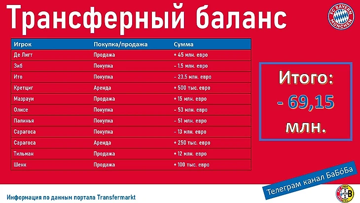 Уволив всех виновных, «Бавария» этим летом снова затеяла очередную масштабную закупку. Несмотря на то, что за последние три сезона это ТО стало наименее расточительным, без крупных трансферов не обошлось.
