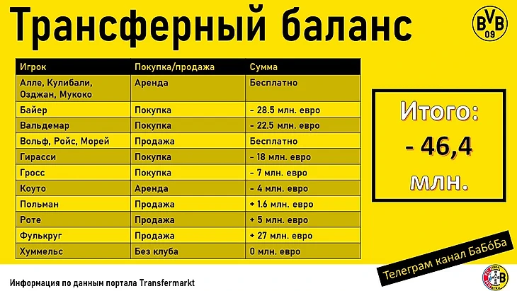 И таким образом легким росчерком в чековой книжке «Боруссия» записывает в баланс - 46 млн. Удивительно, но прошлым летом картина была диаметрально противоположная: +46 млн. к сентябрю. Тогда, правда, позитивным остаться балансу позволил баснословный трансфер Беллингема в «Реал».