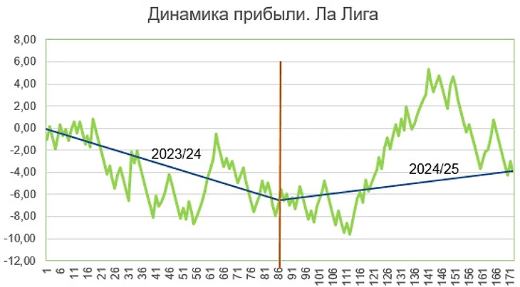 Показал на графики линии тренда по сезонам, и прошлый не очень хороший, тем более, что загружено почти 20% матчей.
