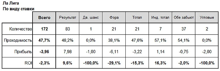 Если делать первоначальные выводы, то с осторожностью можно смотреть в сторону прогнозов на результат (П1, Ничьи, П2), а в дальнейшем я попробую разобрать уже более детально эти показатели.