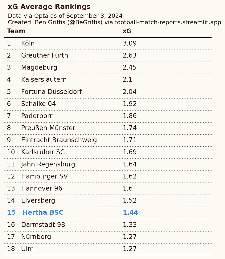 «Герта» действительно очень много владеет мячом (лидеры по среднему проценту владения после 4-ех туров), но есть проблемы с доведением атак до опасных позиций. Таблица выше показывает, что хуже берлинцев в начале сезона создают только 3 команды. Особенно тяжело себя чувствуют фланговые нападающие — молодым Шерханту и Винклеру часто не хватает опыта принять верное решение для развития атаки.