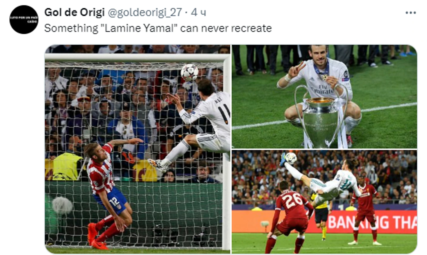 Болельщик «Мадрида» под ником des_xxy разместил в социальной сети X видео знаменитого гола Гарета Бэйла через себя, который он забил в финале Лиги чемпионов в ворота «Ливерпуля».