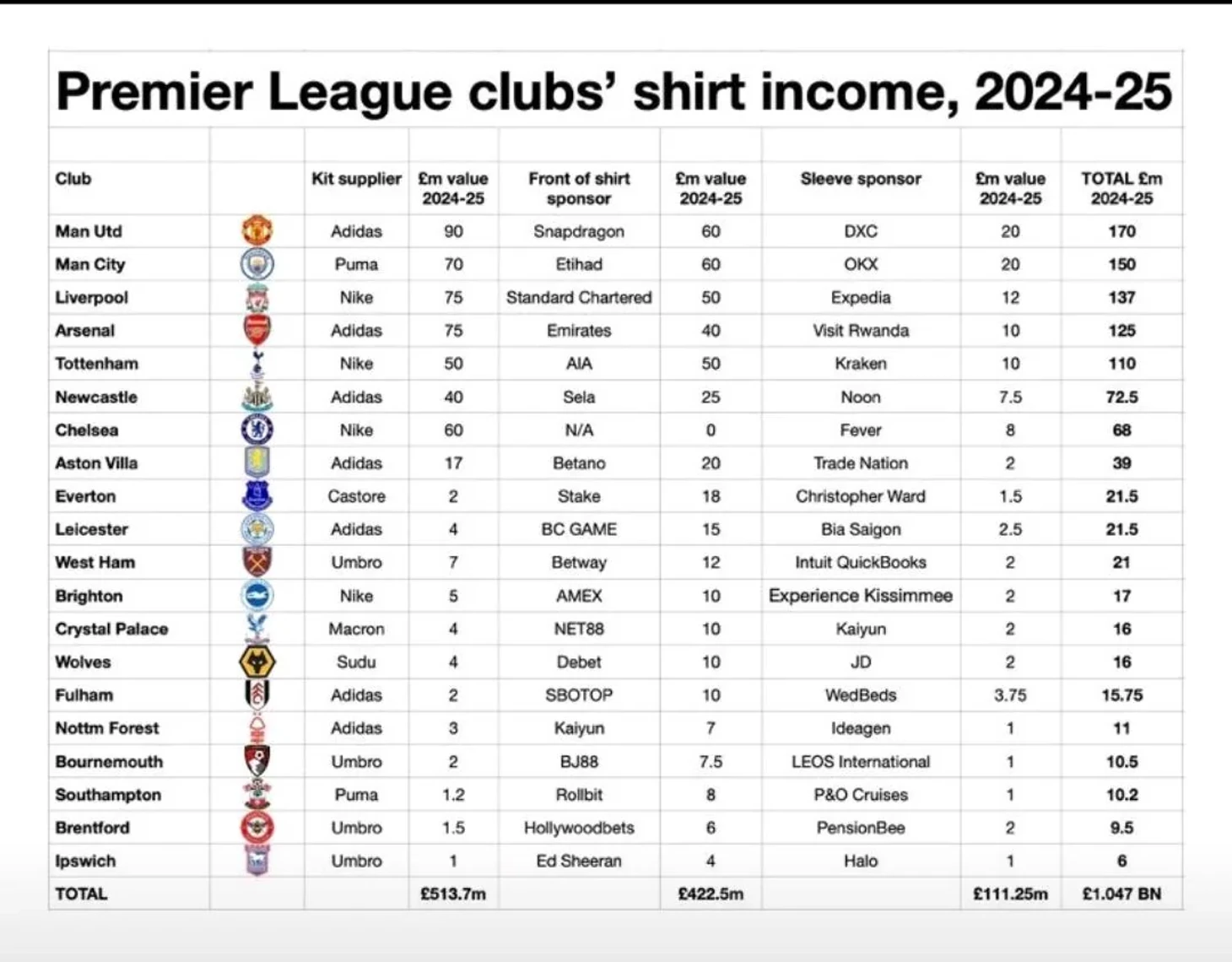 Издание Sporting Intelligence выкатило таблицу, которая показывает, сколько клубы АПЛ получают от контрактов, заполняющих свободное место на игровых джерси. В ней описали сделки как с техническими спонсорами, поставляющими майки и другой мерч, так и теми, которые наносятся на грудь и плечо.