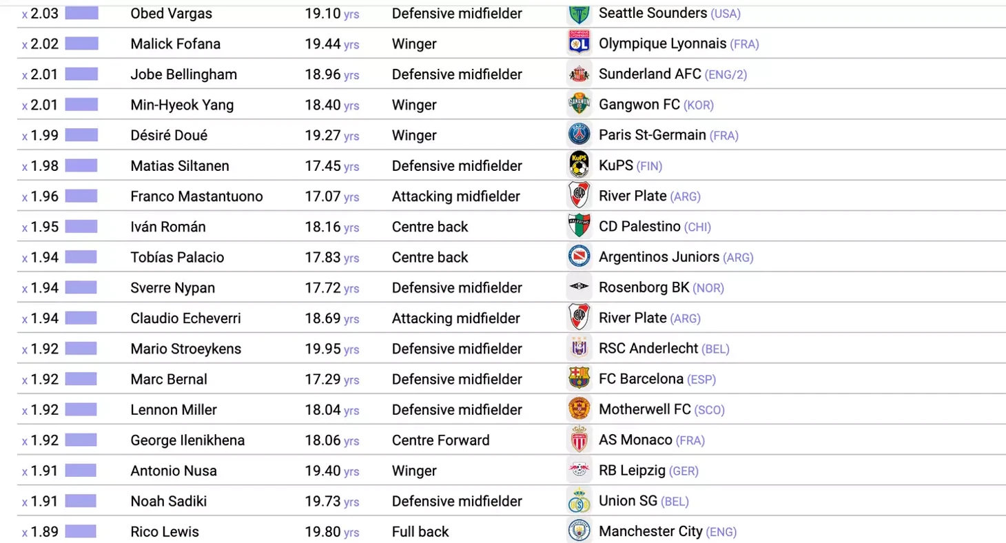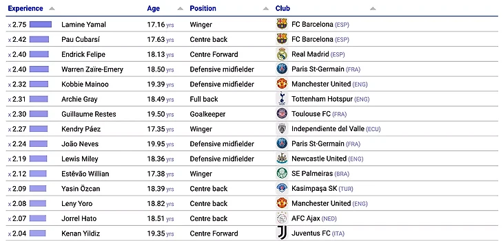 Уровень опыта рассчитывается на основе количества минут, набранных в прошлом сезоне, и чемпионата, в котором он выступает. На втором месте − партнер Ямаля по «Барсе» Пау Кубарси с показателем x2,42, а за ним следует Эндрик − x2,4.
