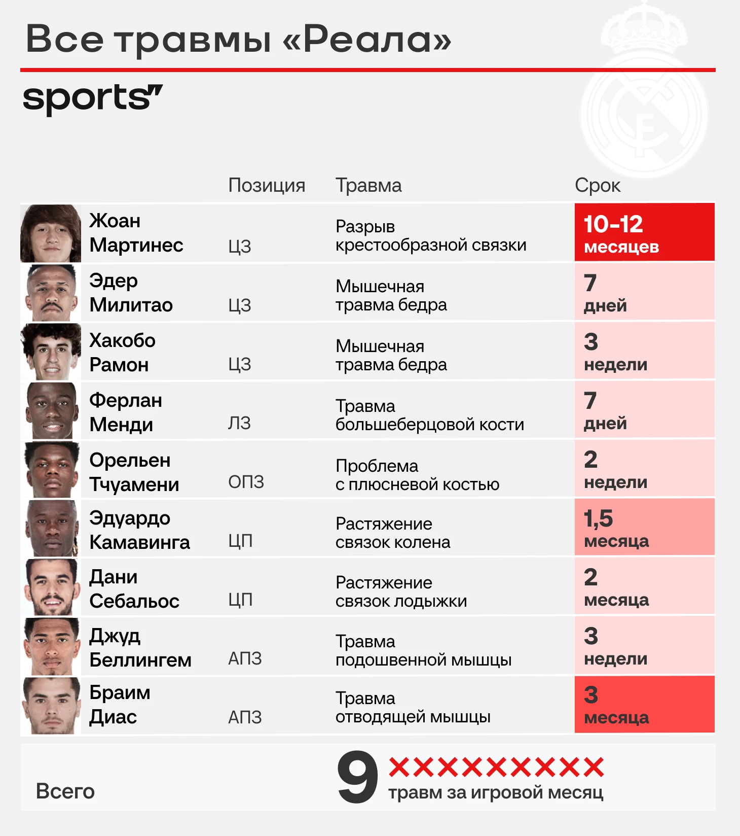 У «Реала» 9 травм за месяц