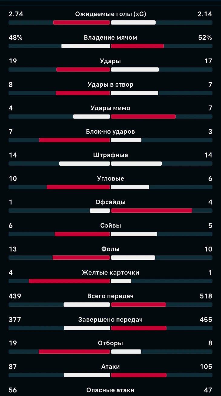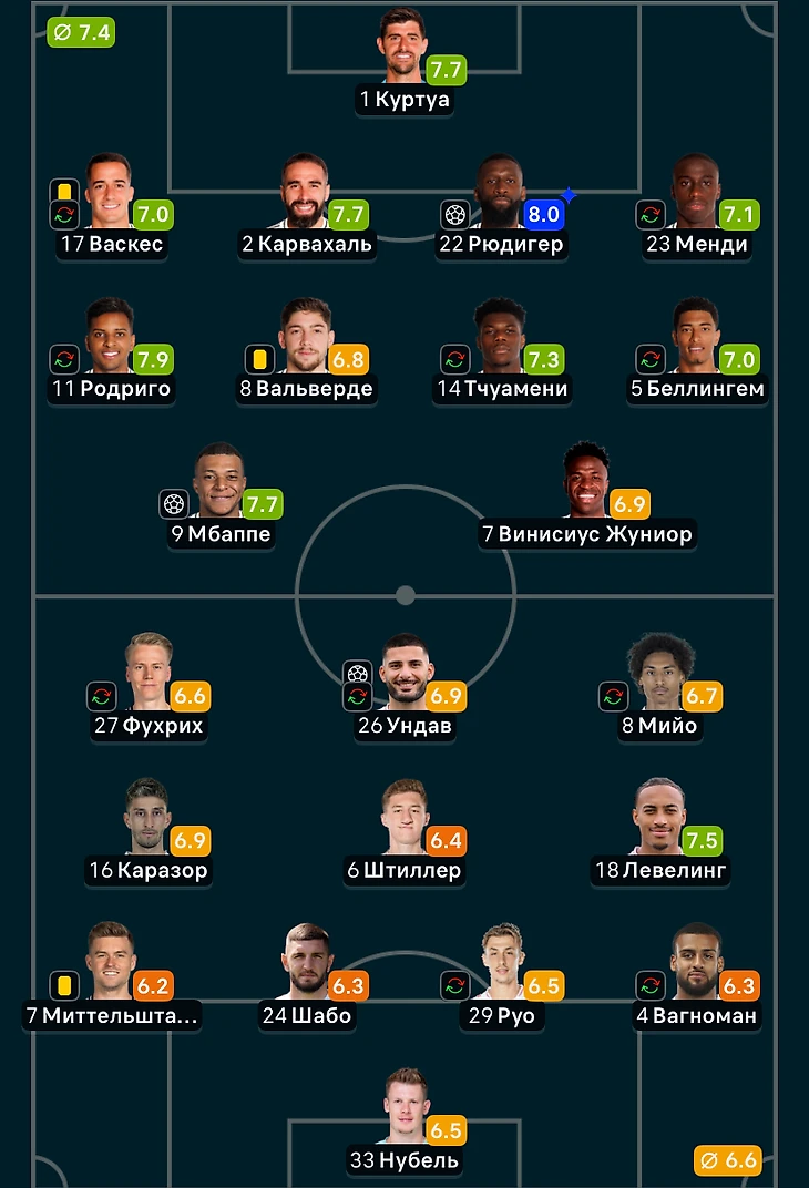 Неудачный пас Васкеса был перехват Штутгарта из за этого Немцы вышли один на один Куртуа но милот не попал по воротам. Мбаппе прошел одного защитника и пробил прямо в вратаря вратарь потащил удар черепашки.Удар Милота в штрафной потрясающей Куртуа. Этот парень отлично проводит сегодняшний матч. Отличный пас пяткой на выход один на один с Куртуа этот супер вратарь потрясающе потащит удар выхода один на один 17’ минута. В начале первого тайма у «Реала» было много проблем в защите защита много ошибалась «Штутгарт» видел дыры в обороне мадридцев и пасовал туда но Сливочным повезло что, у них есть Куртуа он за за 20 минут первого тайма СДЕЛАл очень много отличных сейвов.у Васкеса была подача в штрафную на Джуда только защитники немецкого клуба перехватили пас. Мбаппе обыграл финтом ножницы игрока Штутгарта и пробил по воротам Вратарь потащит удар. «Реал» отдавал пас га пустые ворота Вини вот только защитник в подкате перехватил мяч. Ундав пробил по воротам мяч попал в ногу Карвахаля от него в штангу. Белленгем сыграл в стенку с Мбаппе последний отдал Родриго бразилец обвел одного и пробил мяч попал в защитника от него мяч улетел на угловой. Отличный момент у Ундава но он передержал мяч и отдал пас. Беллингем мог отдать пас на пустые но не и пел за мячом, мяч ушел в отворот. Ундав был очень полезным для Штутгарта он много моментов. Мбаппе передержал мя и упустил хороший момент. В первом тайме «Реал» и «Штутгарт» играли равно 47% на 53% в пользу немцев у «Штутгарта» было больше ударов и моментов но у «Реала» тоже было много моментов подвела реализация Мбаппе он отыграл тайм не очень часто передерживал мяч делал финты когда не надо Винисиус был не сильно заметим но сыграл чуть лучше француза Нормально сыграл Родриго и Белигол. Англичанин сыграл лучше всех из полевых игроков он был полезный много создавал отдавал много точных пасов. Куртуа лучший игрок первого тайма он сделал очень много потрясающих сейвов. Ундав он был самым полезным у Немецкой команды. Тчуамени отдал пас красивейший пас через все поле на Родриго бразилец на отдал на Мбаппе он ввинтил мяч в пустые ворота первый гол Килиана в этой ЛЧ и первый гол Реала в этой ЛЧ. Ундав красиво забил с углового головой в девятку Куртуа всё таки пробили. Модрич отдавал пас на забегание Мбаппе вратарь успел перехватить мяч. ГОООЛ Рюдигер забил с углового ассист Модрича. Выход один на один Винисиуса но вратарь потопил удар. Эндрик забил сумасшедший гол практически с центра. Что поняли в этом матче: «Реал» играл в равный футбол с «Штутгартом» владения мячом было за немцами сливочные играет в этом сезоне средне, но думаю что они со временем разыграются и будут разрывать Ла Лишу и ЛЧ лучший игрок матча по моему мнению Куртуа кстати Тибо лучший игрок матча по версии УЕФА. Штутгарт может выйти в 1/4 финала ЛЧ если постараются этот матч это показал они хорошо играют много создают много владеют мячом. Для меня Реал остается главным фаворитом ЛЧ. В моменте с голом Эндрика было видно что, все игроки не только Мадридцы но немцы ждали от нового Пеле пас все удивились что, он пробил но больше что, он даже забил. Ждем победу от Реала в ЛЧ ? Спасибо за внимание.