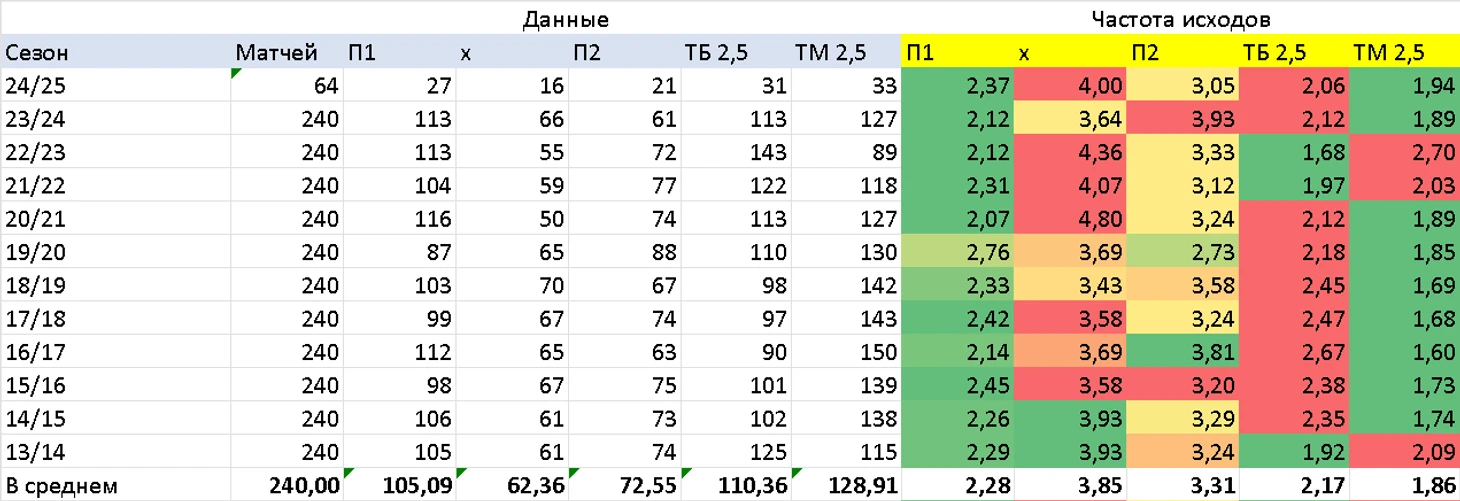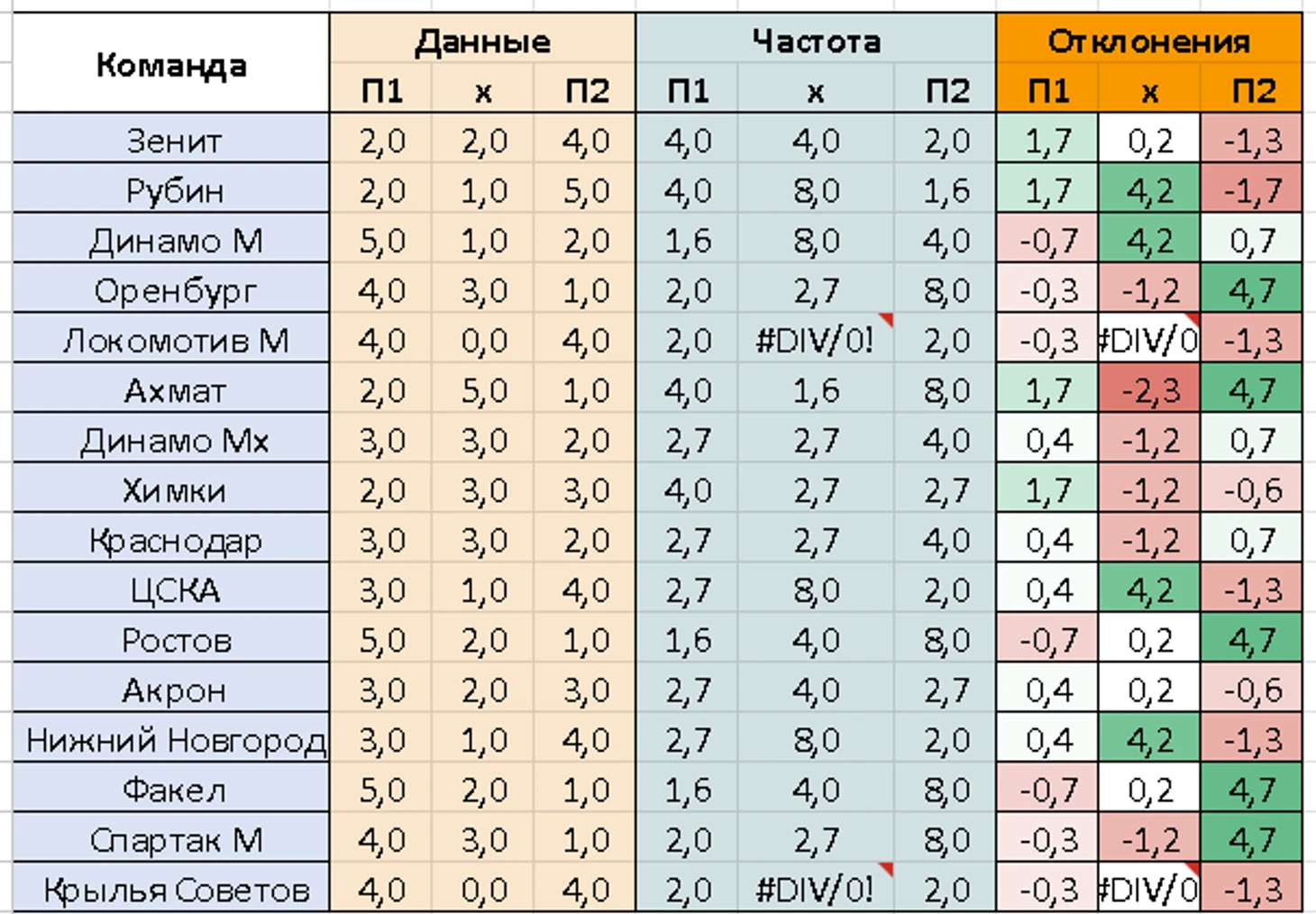По табличке видно, то текущий сезон РПЛ продолжает играться так, как должен. Средние значения частот исходов ровные. А это значит, что все идет своим чередом и надо просто ловить отклонения у команд.