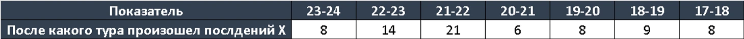 В табличке видно, что если убрать сезоны 22-23 и 21-22, то после 8-9 тура все команды уже сыграли на Х. Но что мешает Локомотиву и Крыльям сыграть без Х условно 20 матчей? Ничего! Я потому Х догонять уже не буду по командам, потому что есть выбросы по исходу и мне это не нравится.