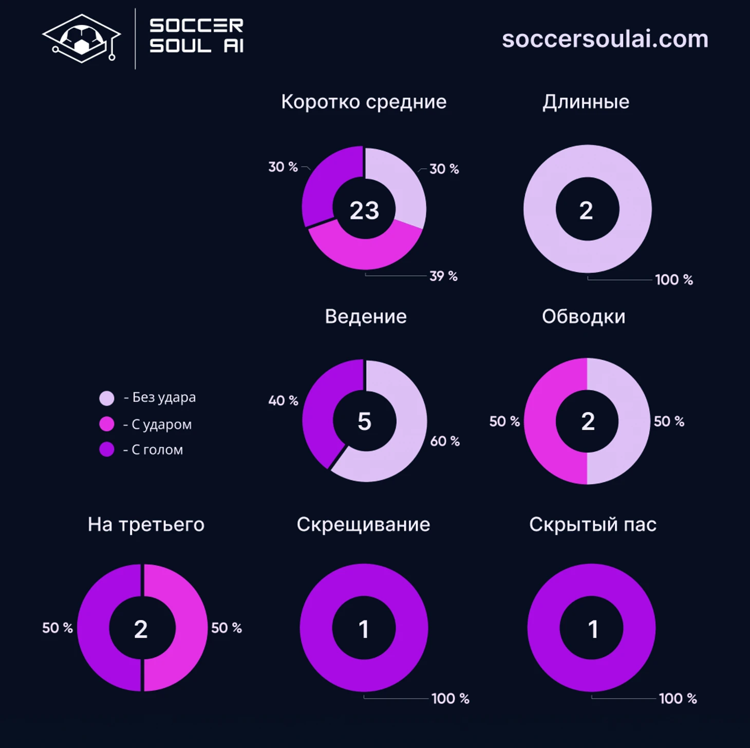 Ключевые метрики игроков: Soccer IQ – качество игры футболиста, относительно нормативов профессионального футбола, с учетом амплуа и сыгранного игрового времени. АВП-баллы – единицы оценки действий игрока, набранные за продвижение мяча через активно выгодную позицию и удары по воротам. Эффективность оценивается долями АВП-баллов, набранных соответственно в ударных и голевых атаках.