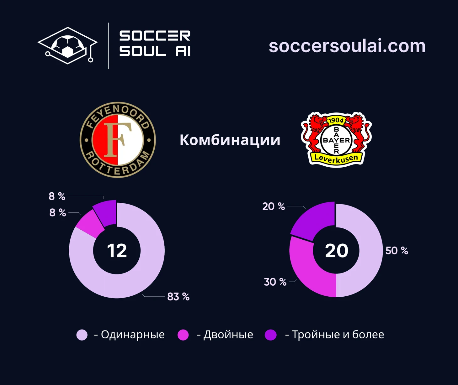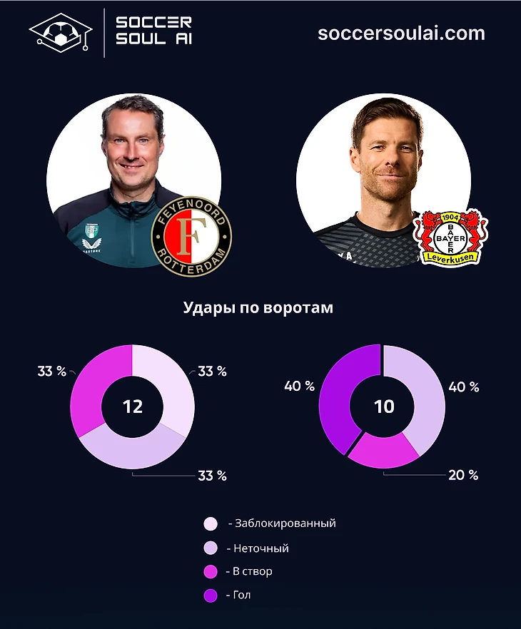 Любопытно, что количество ударов по воротам у Фейеноорда было выше, как в первом (7 vs 6), так и во втором (5 vs 4) таймах. Но, команде, кроме точности, не хватало многоэлементных АВП-атак, имеющих статистически более высокий показатель результативности.