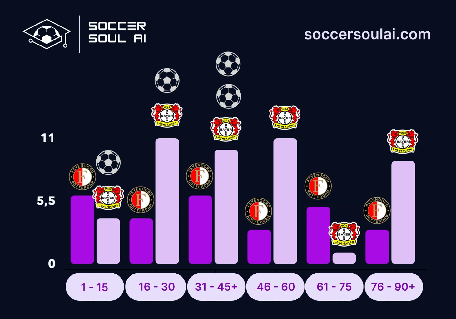 Интервалы с 15-й по 60-ю минуту стали наиболее активными для Байера в этом матче.Если в заключительном отрезке первой половины игры команда Алонсо окончательно решила исход матча, то в стартовом отрезке второго тайма, не позволила сопернику своей активностью включиться в контригру и хотя бы попробовать изменить счёт на табло.