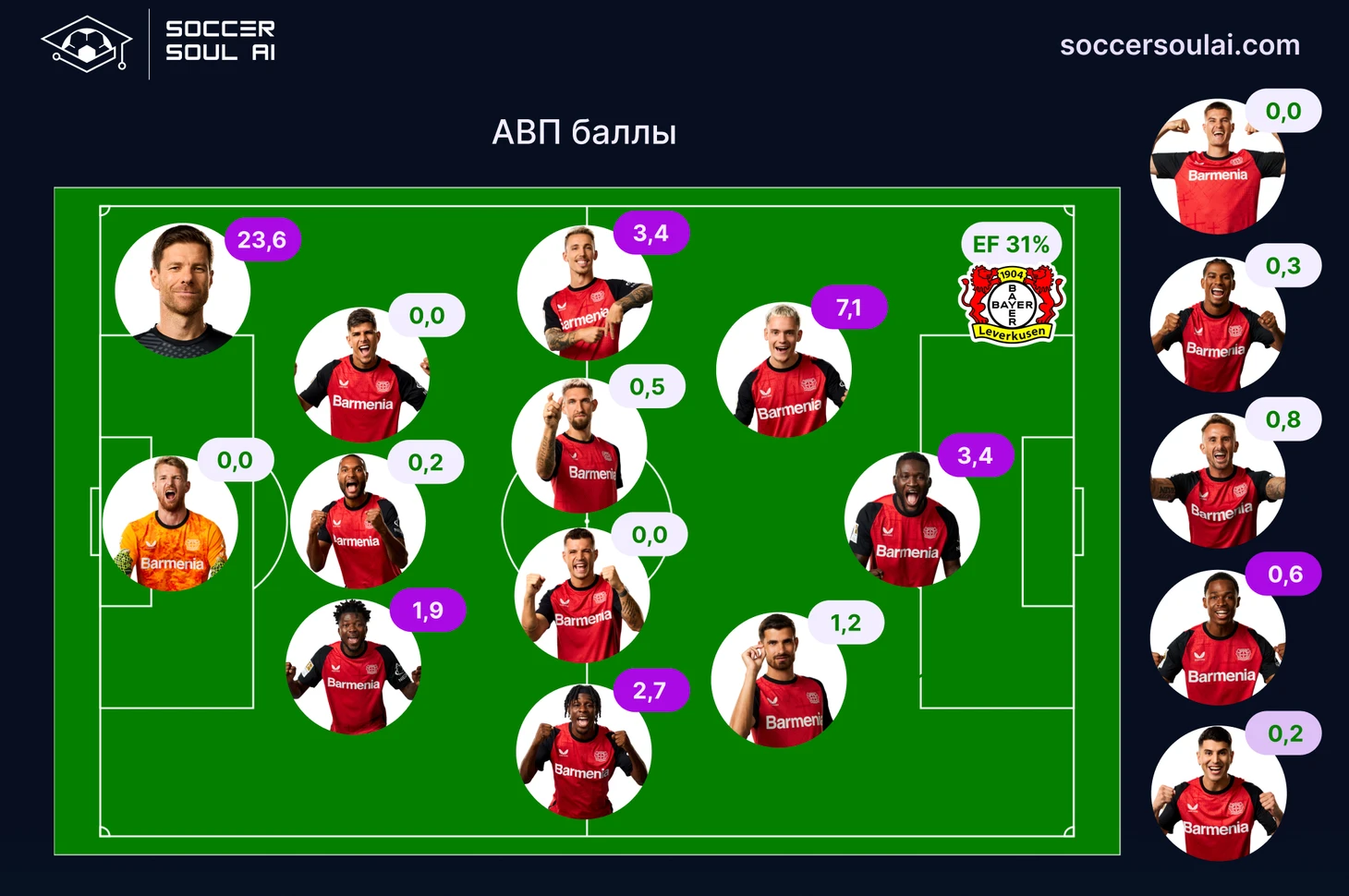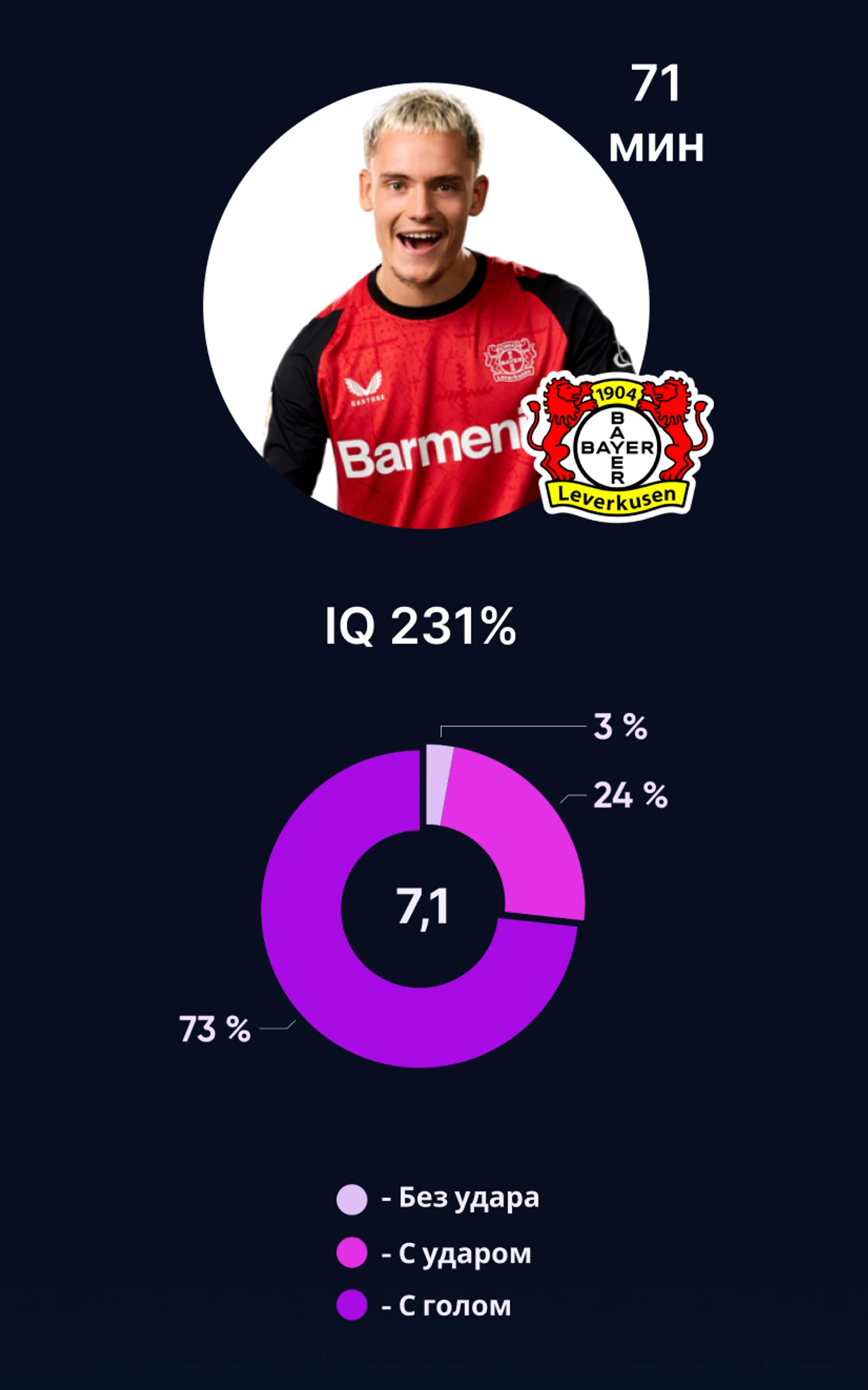 MVP-матча – Флориан Виртц Количество АВП-баллов: 7,1 SoccerIQ 231% На счету игрока - семь успешных АВП-действий всех типов и три удара по воротам с результативностью 67%. Только 3% действий футболиста не приводили к ударам по воротам, что является высочайшим показателем продуктивности!