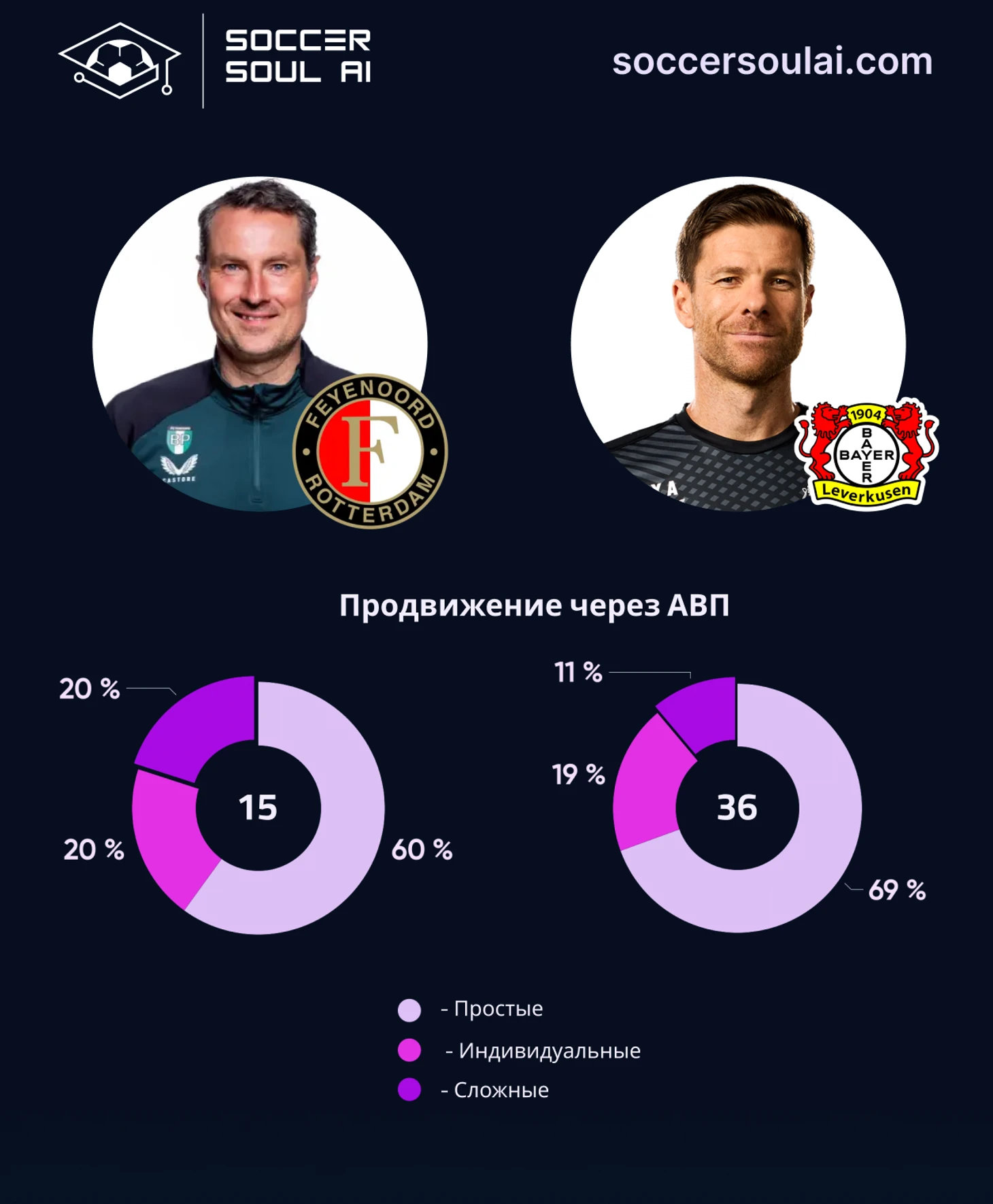 Байер продолжал переигрывать хозяев в фазе продвижения мяча, даже после того, как уже решил по большому счету вопрос с результатом. Количество успешных АВП-действий: 19 vs9 к перерыву, 17 vs 6 – во втором тайме. Простые игровые элементы стали основным типом действий и составили 69%. Фейеноорд в свою очередь показал высокую долю сложных (20%), треть из которых привела к ударам по воротам, но результативности Байера хозяевам достигнуть не удалось.