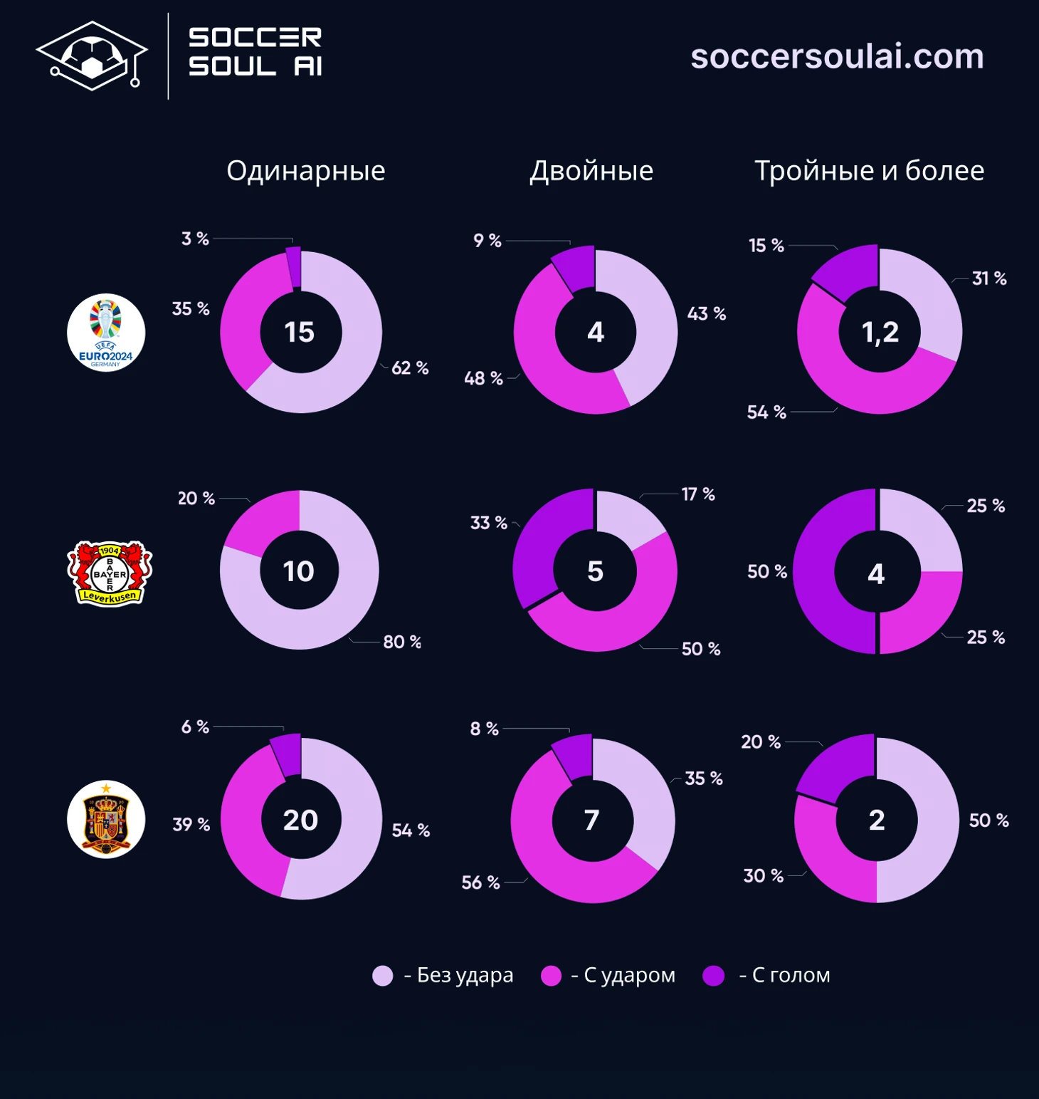 С точки зрения многоэлементных атакующих действий команда Алонсо смотрится выигрышно не только на фоне соперника в этом матче, но и в сравнении с рисунком игры чемпионов Европы. Да, взаимосвязи игроков в сборных командах в сопоставлении с клубными, всегда выглядят скромнее, но в данном случае результативность игровых связок Байера выделяется значительно!