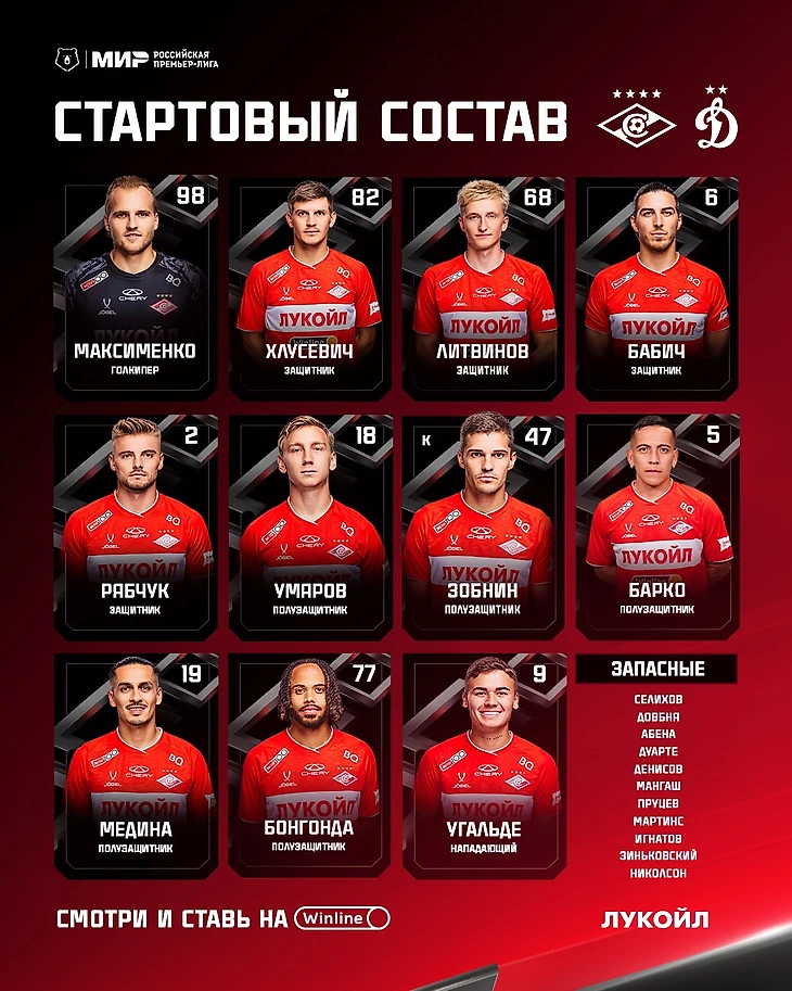 «Спартак»: Максименко, Рябчук, Хлусевич, Литвинов, Бабич, Умяров, Барко, Зобнин (к), Бонгонда, Медина, Угальде.