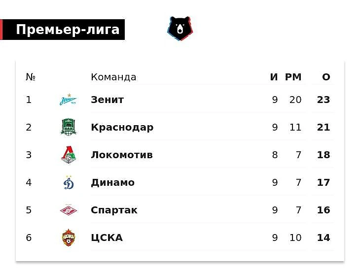 Команды остались на тех же местах. Отставание от лидера увеличилось: у «Зенита» уже 23 очка.