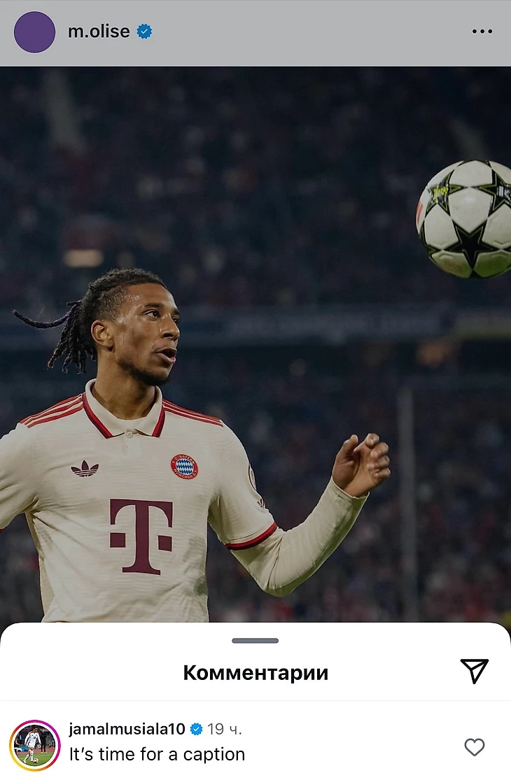 Джамал пытается разговорить Майкла и в соцсетях: француз постит фотографии без подписей. После победы над «Вердером» Мусиала пришел в комменты к товарищу: «Время для подписи».