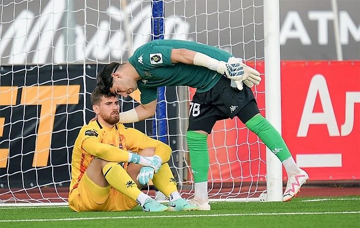«Енисей» – «СКА-Хабаровск» – 2:2. Вратарь хабаровчан Ислам Имамов утешает коллегу из «Енисея» Сергея Антипина