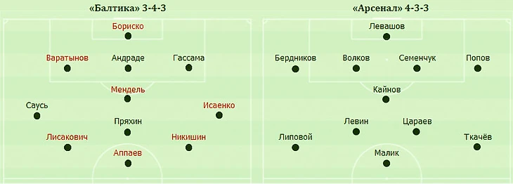Наставник «Балтики» Андрей Талалаев избрал на матч с лидером любимую расстановку 3-4-3, которую ранее использовал в «Химках», и ввел в стартовый состав семь новых, по сравнению с прошлым матчем, игроков. Тогда как «Арсенал» полностью сохранил состав и схему из победного поединка 10-го тура с «Уралом»...
