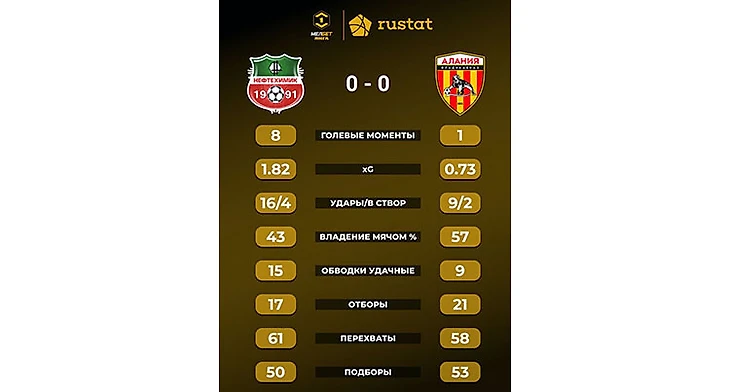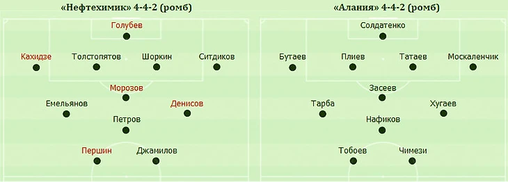 При новом наставнике – вернувшимся на капитанский мостик «Алании» Спартаке Гогниеве – владикавказцы отзеркалила расстановку «Нефтехимика» и тоже сыграли по схеме 4-4-2 с построением «ромб» в линии полузащиты. За весь первый тайм команды нанесли лишь по одному удару в створ: немудрено, что к перерыву на табло сохранились нули.