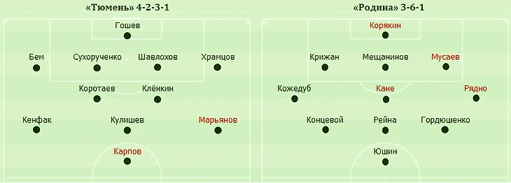 По ходу всего матча «Родина» была конкретнее и интересней хозяев поля, много атаковала и била по чужим воротам. Однако первыми отличились тюменцы, которым повезло с пенальти. Мяч попал в отставленную руку Мусаеву, а Кулишев ударом с точки развел вратаря и мяч по разным углам.