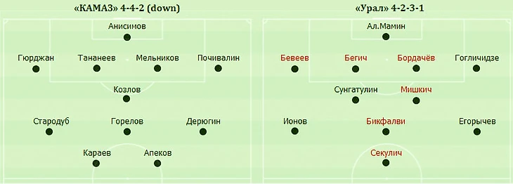 После поражения в предыдущем туре от «Арсенала» тренерский штаб «Урала» произвел шесть изменений в стартовом составе и немного изменил функции отдельных игроков. Так, например, обычно игравший под нападающим Егорычев на этот раз действовал в зоне слева, а на его позицию вышел Бикфалви…