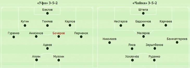 Однако, играя всю вторую половину матча в большинстве, «Уфа» так и не сумела продавить оборону соперника. Хотя три «железных» момента в концовке игры, когда у «Чайки» начала проявляться усталость, хозяев имели. Сначала Адаев, замыкая диагональную передачу партнера, попал в сетку с внешней стороны ворот. Затем после острого навеса пробил выше перекладины нападающий хозяев Ложкин. А на шестой компенсированной минуте из убойнешей позиции не попал в створ Перченок. У гостей по ходу второго тайма тоже возник стопроцентный голевой момент, однако вышедший один на один с вратарем Руденко свой шанс упустил.