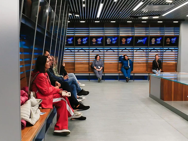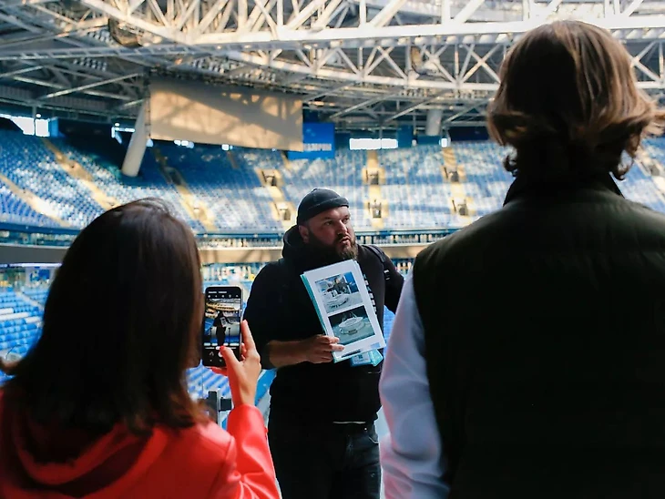 О том, какие еще секреты хранит стадион, мы поговорим на экскурсии по Газпром Арене. Это возможность своими глазами увидеть сохранившиеся постройки старого стадиона имени Кирова, технический тоннель, по которому на поле завозят оборудование, а также впечатляющую панораму города и Морского фасада с верхнего яруса арены. На экскурсии мы пройдем путь футболистов на поле из «сердца стадиона» – раздевалки клуба «Зенит», внутри которой тоже узнаем много интересного, например, как распределяются места для игроков или как подается сигнал о том, что закончился перерыв между таймами (для этого существует специальная синяя лампа-маяк).